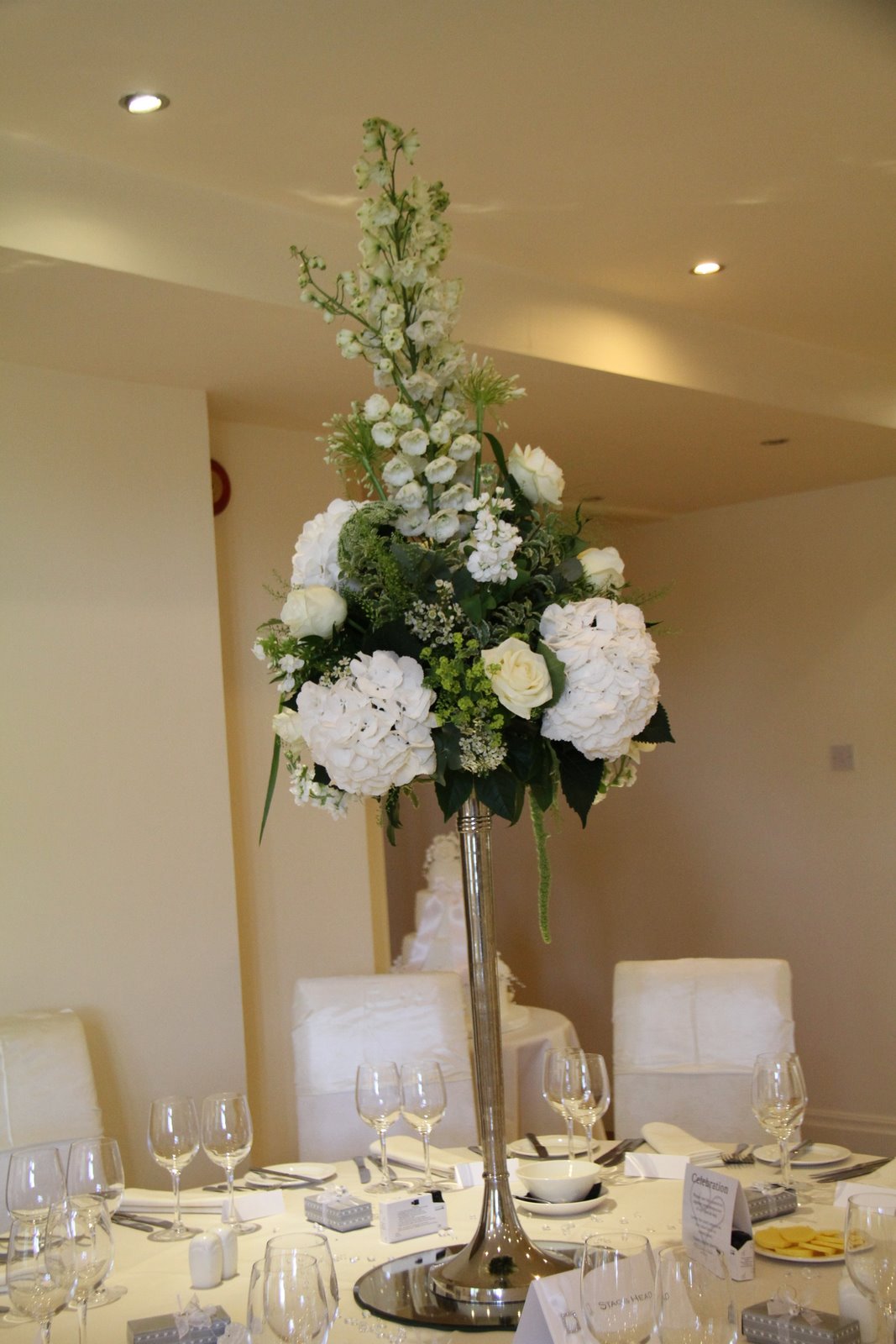 Fabulous Silver Candlesticks dressed with a tall elegant design of Delphiniums, Roses & Hydramgeas